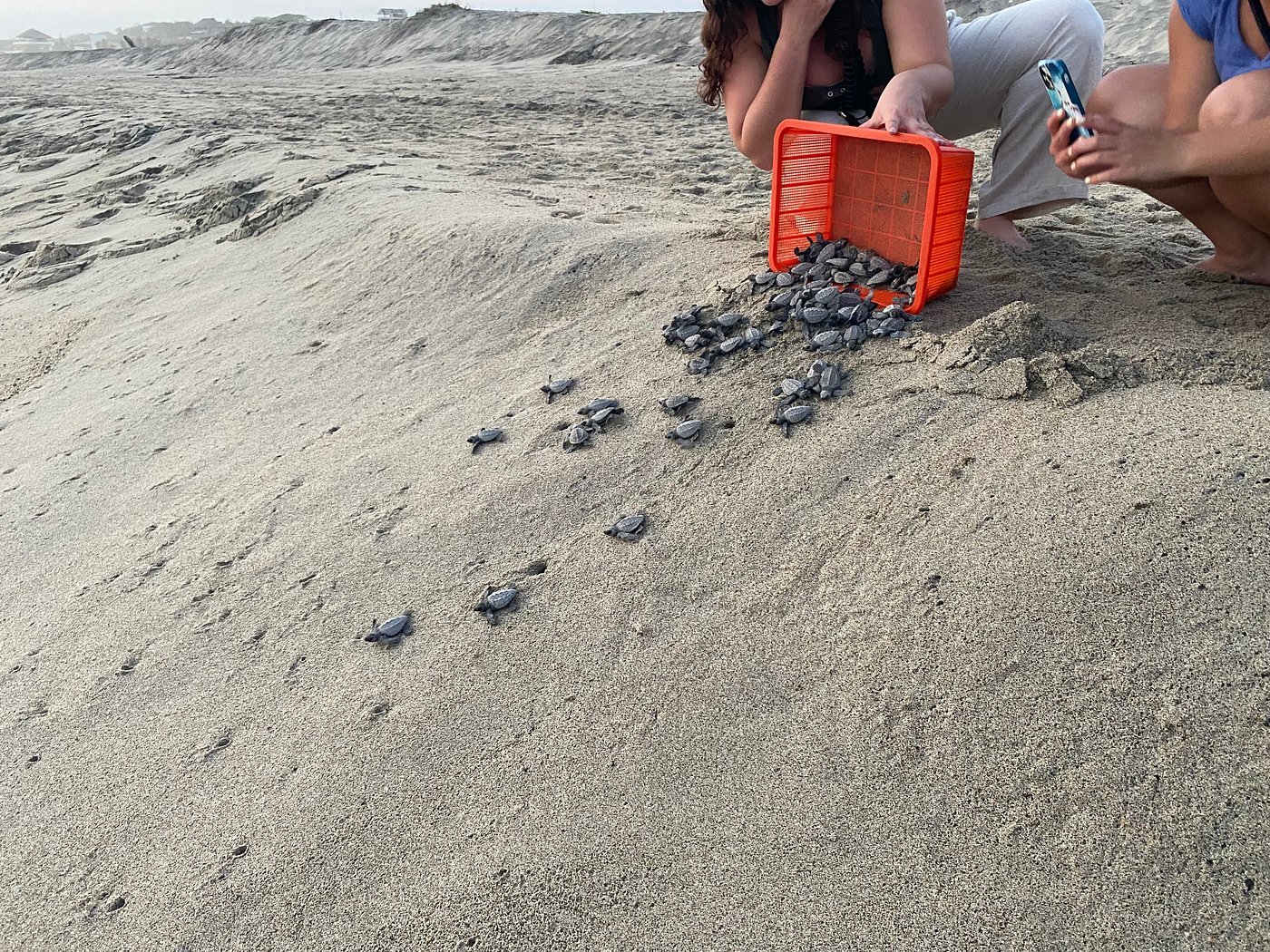 del guía liberar a las pequeñas tortugas mientras observa como las tortugas bebes se alejan y se van adentrando al