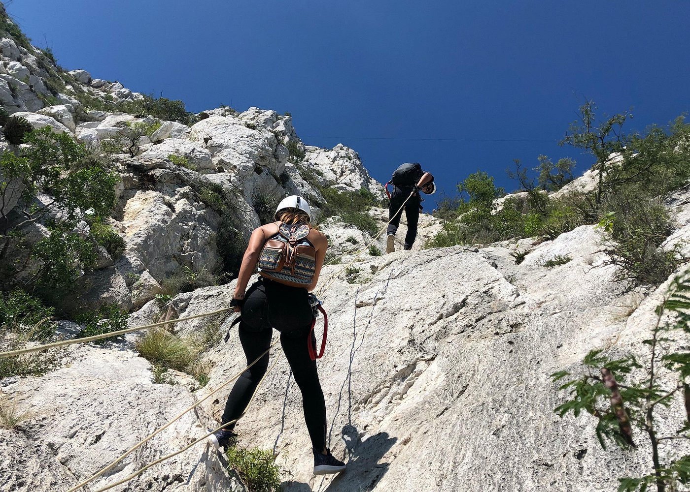 Llegando al cañon de la Huasteca, el guía te equipará con un arnés, casco y un kit de escalada. La primera caminata para llegar a los primeros puntos de vista es de aproximadamente 90 minutos por senderos de montaña y chorreaderos de piedras. Hay una sección de escalada sencilla donde usaremos cables de seguridad para llegar a la cima. Después de esta sección, empezamos a realizar un primer rappel para llegar al Nido de los Aguiluchos, una cueva abierta en medio de la montaña. Nos detenemos para tomar agua, comer algún snack y tomar fotos. Luego seguimos realizando 3 rappeles de 35 metros cada uno para descender, y caminar de regreso para volver a los vehículos y volver al punto de encuentro.